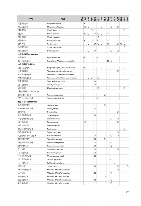 307 등얼룩풍뎅이 Blitopertha orientalis ○ 연노랑풍뎅이 Blitopertha pallidipennis ○ ○ ○ ○ ○ 금줄풍뎅이 Mimela holosericea ○ ○ 풍뎅이 Mimela splendens ○ ○ ○ ○ ○ ○ 별줄풍뎅이 Mimela testaceipes ○ 참콩풍뎅이 Popillia favosellata ○ ○ ○ ○ ○ ○ 콩풍뎅이 Popillia mutans ○ ○ ○ ○ ○ ○ ○ ○ 녹색콩풍뎅이 Popillia quadriguttata ○ 등노랑풍뎅이 Spilota plagicollis ○ ○ ○ ○ 소똥구리과 Scarabaeidae 홈줄풍뎅이 Bifurcanomala aulax ○ ○ ○ 모가슴소똥풍뎅이 Onthophagus Phanaeomorphus fo...