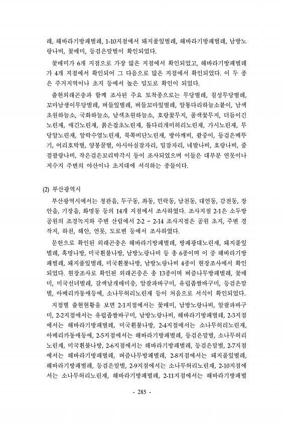 레, 해바라기방패벌레, 1-10지점에서 돼지풀잎벌레, 해바라기방패벌레, 남방노 랑나비, 꽃매미, 등검은말벌이 확인되었다. 꽃매미가 6개 지점으로 가장 많은 지점에서 확인되었고, 해바라기방패벌레 가 4개 지점에서 확인되어 그 다음으로 많은 지점에서 확인되었다. 이 두 종 은 주거지역이나 초지 등에서 높은 밀도로 확인이 되었다. 출현외래곤충과 함께 조사된 주요 토착종으로는 무당벌레, 칠성무당벌레, 꼬마남생이무당벌레, 버들잎벌레, 버들꼬마잎벌레, 알통다리하늘소붙이, 남색 초원하늘소, 국화하늘소, 남색초원하늘소, 호랑꽃무지, 풀색꽃무지, 더듬이긴 노린재, 애긴노린재, 붉은잡초노린재, 톱다리개미허리노린재, 가시노린재, 무 당알노린재, 알락수염노린재, 북쪽비단노린재, 방아깨비, 팥중이, 등검은메뚜 기, 어리호박벌, 양...