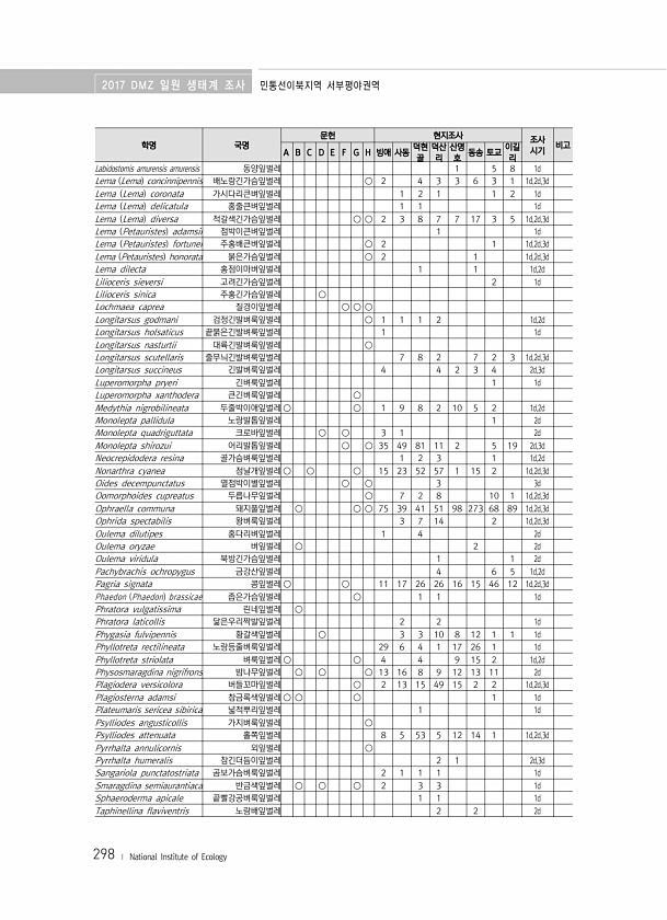 2017 DMZ 일원 생태계 조사 민통선이북지역 서부평야권역 298 ? National Institute of Ecology 학명 국명 문헌 현지조사 조사 A B C D E F G H 빙애 사동 덕현 시기 비고 골 덕산 리 산명 호 동송 토교 이길 리 Labidostomis amurensis amurensis 동양잎벌레 1 5 8 1d Lema Lema concinnipennis 배노랑긴가슴잎벌레 ○ 2 4 3 3 6 3 1 1d,2d,3d Lema Lema coronata 가시다리큰벼잎벌레 1 2 1 1 2 1d Lema Lema delicatula 홍줄큰벼잎벌레 1 1 1d Lema Lema diversa 적갈색긴가슴잎벌레 ○ ○ 2 3 8 7 7 17 3 5 1d,2d,3d Lema Petauriste...