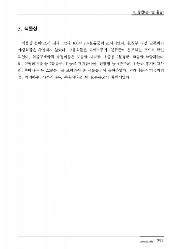 Ⅲ. 종합 분야별 총평 www.nie.re.kr ? 299 3. 식물상 식물상 분야 조사 결과 72과 166속 207분류군이 조사되었다. 환경부 지정 멸종위기 야생식물은 확인되지 않았다. 고유식물은 새끼노루귀 1분류군이 분포하는 것으로 확인 되었다. 식물구계학적 특정식물은 Ⅴ등급 자리공, 초종용 2분류군, Ⅲ등급 노랑하늘타 리, 큰꿩의비름 등 7분류군, Ⅱ등급 갯기름나물, 진황정 등 4분류군, Ⅰ등급 홍지네고사 리, 후박나무 등 22분류군을 포함하여 총 35분류군이 출현하였다. 외래식물은 미국자리 공, 창명아주, 아까시나무, 주홍서나물 등 16분류군이확인되었다.