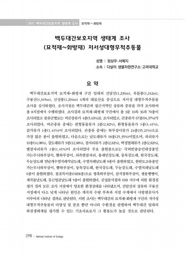 2017 백두대간보호지역 생태계 조사 묘적재 화방재 298 ? National Institute of Ecology 백두대간보호지역 생태계 조사 묘적재화방재 저서성대형무척추동물 성명 정상우·서예지 소속 다살이 생물자원연구소·고려대학교 요 약 백두대간보호지역 묘적재화방재 구간 일대의 선달산 1,236m , 옥돌봉 1,242m , 구룡산 1,345m , 신성봉 1,294m 4개의 대표산을 중심으로 저서성 대형무척추동물 조사를 실시하였다. 조사지점은 백두대간과 접근지역인 상류와 중류를 각각 조사하여 총 8지점에서 수행하였다. 조사결과 묘적재화방재 구간에서 총 3문 10목 36과 70종이 조사되었고 분류군별로는 비곤충류가 4종 5.63% 로 조사되었고, 곤충류가 67종 94.37% 가 조사되었다. 비곤충류 중에는 ...
