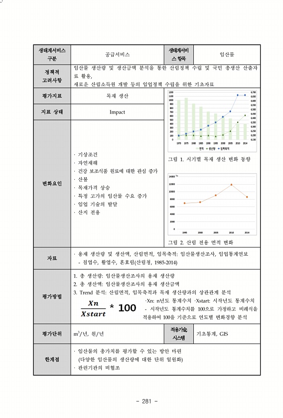 281 생태계서비스 구분 공급서비스 생태계서비 스 항목 임산물 정책적 고려사항 임산물 생산량 및 생산금액 분석을 통한 산림정책 수립 및 국민 총생산 산출자 료 활용, 새로운 산림소득원 개발 등의 임업정책 수립을 위한 기초자료 평가지표 목재 생산 그림 1. 시기별 목재 생산 변화 동향 그림 2. 산림 전용 면적 변화 지표 상태 Impact 변화요인 · 기상조건 · 자연재해 · 건강 보조식품 원료에 대한 관심 증가 · 산불 · 목재가격 상승 · 특정 고가의 임산물 수요 증가 · 임업 기술의 발달 · 산지 전용 자료 · 용재 생산량 및 생산액, 산림면적, 임목축적임산물생산조사, 임업통계연보 침엽수, 활엽수, 혼효림 산림청, 1985-2014 평가방법 1. 총 생산량임산물생산조사의 용재 생산량 2. 총 생산액임산물...