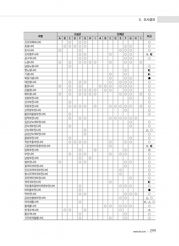 Ⅱ. 조사결과 www.nie.re.kr ? 299 국명 고성군 인제군 비고 A B C D F G H I A B C D E F G H I 긴꼬리제비나비 ○ ○ ○ ○ 호랑나비 ○ ○ ○ ○ ○ ○ ○ ○ 모시나비 ○ ○ ○ ○ ○ ○ 꼬리명주나비 ○ ○ ○ ○ ○ ☆, ◐ 갈구리나비 ○ ○ ○ ○ ○ 노랑나비 ○ ○ ○ ○ ○ ○ ○ ○ ○ ○ 남방노랑나비 ○ ○ 멧노랑나비 ○ ◐ 기생나비 ○ ○ ◐ 북방기생나비 ○ ○ ○ ● 대만흰나비 ○ ○ ○ ○ ○ ○ ○ ○ 줄흰나비 ○ ○ ○ ○ ○ ○ ○ ○ ○ ○ 큰줄흰나비 ○ ○ ○ ○ ○ ○ ○ ○ ○ ○ 배추흰나비 ○ ○ ○ ○ ○ ○ ○ ○ ○ ○ ○ 쇳빛부전나비 ○ ○ 선녀부전나비 ○ ○ 푸른부전나비 ○ ○ ○ ○ ○ ○ ○ ○ ○ ○ ○ ○ 산푸른부전나...