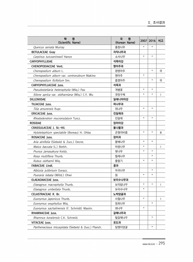 Ⅱ. 조사결과 www.nie.re.kr ? 295 학 명 Scientific Name 국 명 Korean Name 2007 2016 비고 Quercus serrata Murray 졸참나무 * * BETULACEAE Gray 자작나무과 Carpinus turczaninowii Hance 소사나무 * * CARYOPHYLLIDAE 석죽아강 CHENOPODIACEAE Vent. 명아주과 Chenopodium album L. 흰명아주 * 귀 Chenopodium album var. centrorubrum Makino 명아주 * Chenopodium ficifolium Sm. 좀명아주 * 귀 CARYOPHYLLACEAE Juss. 석죽과 Pseudostellaria heterophylla Miq. Pax 개별꽃 * ...