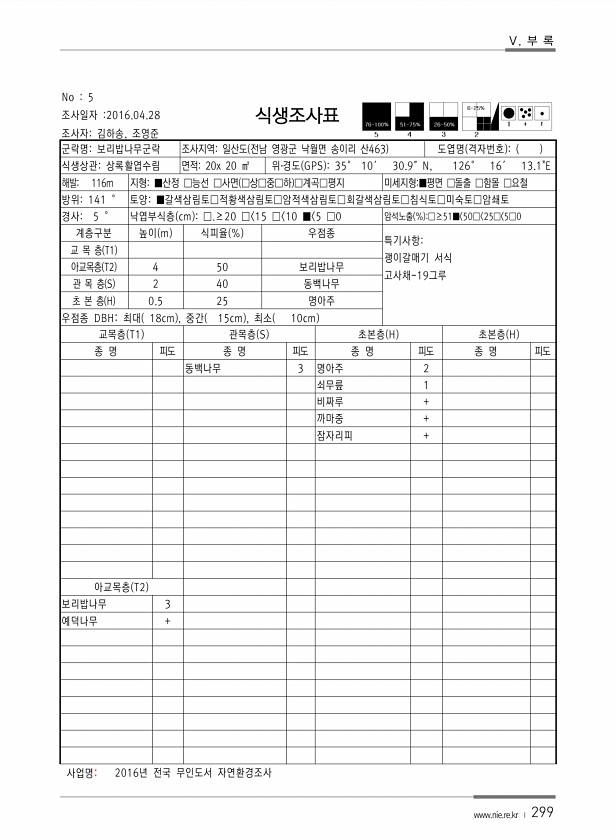 Ⅴ. 부 록 www.nie.re.kr ? 299 No 5 조사일자 2016.04.28 조사자김하송, 조영준 식생조사표 군락명보리밥나무군락 조사지역일산도 전남 영광군 낙월면 송이리 산463 도엽명 격자번호 식생상관상록활엽수림 면적20x 20 ㎡ 위?경도 GPS 35° 10′ 30.9″N, 126° 16′ 13.1E 해발116m 지형■산정 □능선 □사면 □상□중□하 □계곡□평지 미세지형■평면 □돌출 □함몰 □요철 방위141 ° 토양■갈색삼림토□적황색삼림토□암적색삼림토□회갈색삼림토□침식토□미숙토□암쇄토 경사5 ° 낙엽부식층 cm □.≥20 □ 15 □ 10 ■ 5 □0 암석노출 % □≥51■ 50□ 25□ 5□0 계층구분 높이 m 식피율 % 우점종 특기사항괭이갈매기 서식 고사채-19그루 교 목 층 T1 아교목층 ...