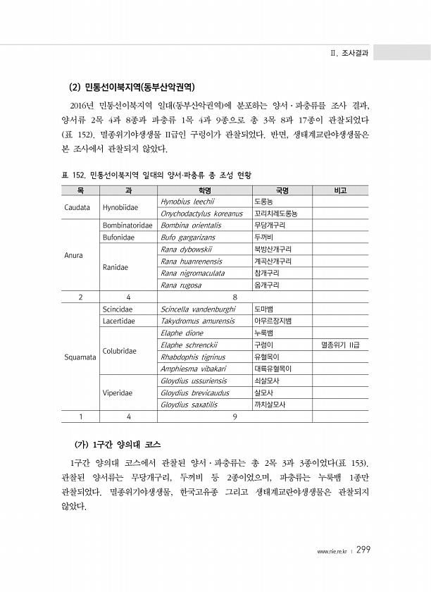 Ⅱ. 조사결과 www.nie.re.kr ? 299 2 민통선이북지역 동부산악권역 2016년 민통선이북지역 일대 동부산악권역 에 분포하는 양서·파충류를 조사 결과, 양서류 2목 4과 8종과 파충류 1목 4과 9종으로 총 3목 8과 17종이 관찰되었다 표 152 멸종위기야생생물 II급인 구렁이가 관찰되었다. 반면, 생태계교란야생생물은 본 조사에서 관찰되지 않았다. 목 과 학명 국명 비고 Caudata Hynobiidae Hynobius leechii 도롱뇽 Onychodactylus koreanus 꼬리치레도롱뇽 Anura Bombinatoridae Bombina orientalis 무당개구리 Bufonidae Bufo gargarizans 두꺼비 Ranidae Rana dybowskii 북방산개구리 Rana ...