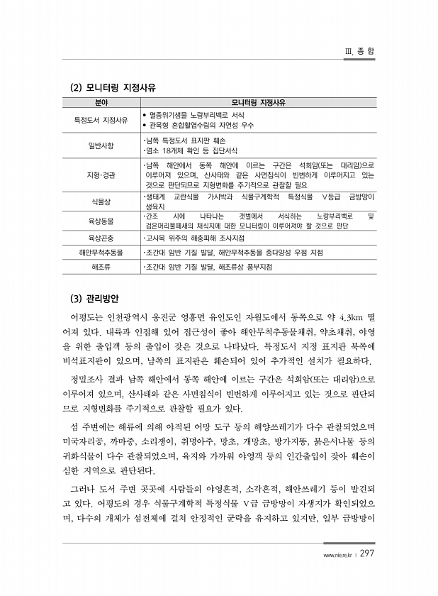 Ⅲ. 종 합 www.nie.re.kr ? 297 2 모니터링 지정사유 분야 모니터링 지정사유 특정도서 지정사유 ? 멸종위기생물 노랑부리백로 서식 ? 관목형 혼합활엽수림의 자연성 우수 일반사항 ?남쪽 특정도서 표지판 훼손 ?염소 18개체 확인 등 집단서식 지형·경관 ?남쪽 해안에서 동쪽 해안에 이르는 구간은 석회암 또는 대리암 으로 이루어져 있으며, 산사태와 같은 사면침식이 빈번하게 이루어지고 있는 것으로 판단되므로 지형변화를 주기적으로 관찰할 필요 식물상 ?생태계 교란식물 가시박과 식물구계학적 특정식물 Ⅴ등급 금방망이 생육지 육상동물 ?간조 시에 나타나는 갯벌에서 서식하는 노랑부리백로 및 검은머리물떼새의 채식지에 대한 모니터링이 이루어져야 할 것으로 판단 육상곤충 ?고사목 위주의 해충피해 조사지점 해안무척추...