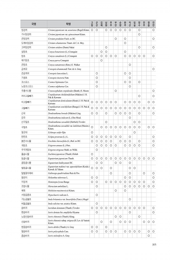 305 엉겅퀴 Cirsium japonicum var. ussuriense Regel Kitam. ○ ○ ○ ○ ○ ○ ○ ○ ○ ○ 가시엉겅퀴 Cirsium japonicum var. spinossimum Kitam. ○ 큰엉겅퀴 Cirsium pendulum Fisch. ex DC. ○ ○ ○ 도깨비엉겅퀴 Cirsium schantarense Trautv. & C.A. Mey. ○ 고려엉겅퀴 Cirsium setidens Dunn Nakai ○ ○ ○ 실망초 Conyza bonariensis L. Cronquist ○ ○ ○ 망초 Conyza canadensis L. Cronquist ○ ○ ○ ○ ○ ○ ○ ○ ○ ○ ○ ○ 애기망초 Conyza parva Cronquist ○ 큰망초 Conyza su...