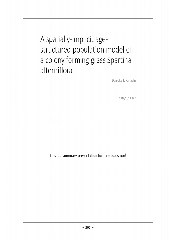 This is a summary presentation for the discussion! A spatially-implicit agestructured population model of a colony forming grass Spartina alterniflora Daisuke Takahashi 2017/12/14, NIE 293