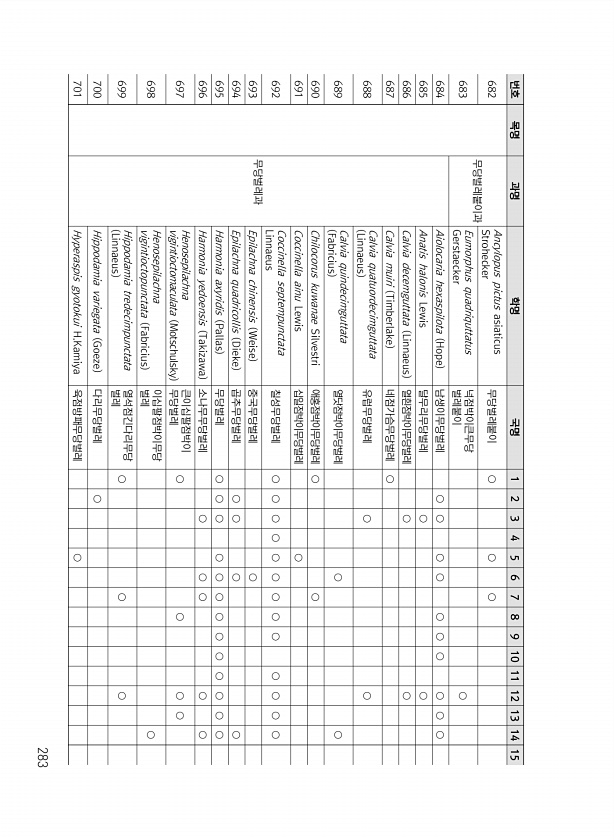 283 번호 목명 과명 학명 국명 1 2 3 4 5 6 7 8 9 10 11 12 13 14 15 682 무당벌레붙이과 Ancylopus pictus asiaticus Strohecker 무당벌레붙이 ○ ○ ○ 683 Eumorphus quadriquttatus Gerstaecker 넉점박이큰무당 벌레붙이 ○ 684 무당벌레과 Aiolocaria hexaspilota Hope 남생이무당벌레 ○ ○ ○ ○ ○ ○ ○ ○ ○ ○ 685 Anatis halonis Lewis 달무리무당벌레 ○ ○ 686 Calvia decemguttata Linnaeus 열흰점박이무당벌레 ○ ○ 687 Calvia muiri Timberlake 네점가슴무당벌레 ○ 688 Calvia quatuordecimguttata Linnae...