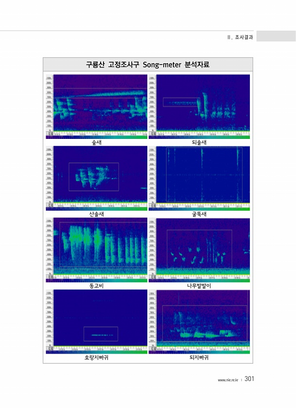 Ⅱ. 조사결과 www.nie.re.kr ? 301 구룡산 고정조사구 Song-meter 분석자료 숲새 되솔새 산솔새 굴뚝새 동고비 나무발발이 호랑지빠귀되지빠귀