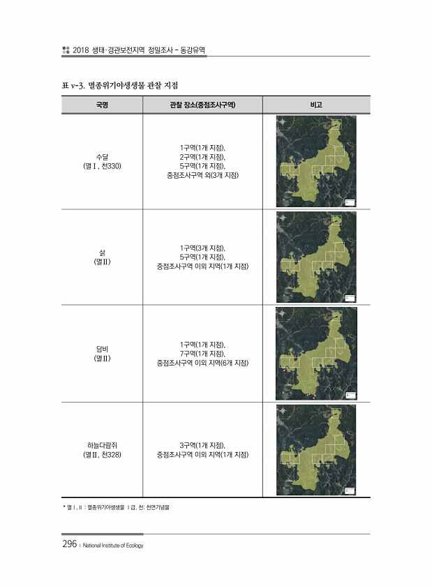 2018 생태·경관보전지역 정밀조사 동강유역 296 ? National Institute of Ecology 국명 관찰 장소 중점조사구역 비고 수달 멸Ⅰ, 천330 1구역 1개 지점 , 2구역 1개 지점 , 5구역 1개 지점 , 중점조사구역 외 3개 지점 삵 멸Ⅱ 1구역 3개 지점 , 5구역 1개 지점 , 중점조사구역 이외 지역 1개 지점 담비 멸Ⅱ 1구역 1개 지점 , 7구역 1개 지점 , 중점조사구역 이외 지역 6개 지점 하늘다람쥐 멸Ⅱ, 천328 3구역 1개 지점 , 중점조사구역 이외 지역 1개 지점 표 v-3. 멸종위기야생생물 관찰 지점 * 멸Ⅰ,Ⅱ 멸종위기야생생물 Ⅰ급, 천천연기념물