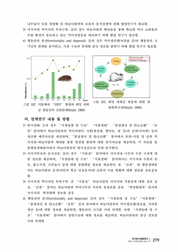 나무높이 등을 정량화 및 하늘다람쥐와 조류의 둥지경쟁에 관해 협업연구가 필요함. 3 서식지내 먹이자원 목록구축③의 경우 하늘다람쥐 배설물을 통해 확보한 먹이 소화물과 주변 환경의 분포하고 있는 먹이자원들을 대조하기 위해 협업 연구가 필요함. 4 행동권과 분산 territoriality and dispersal ④의 경우 먹이생산량 낙과율 등 과 행동권의 크 기간의 관계를 분석하고, 식생 구조와 연계해 분산 경로를 밝히기 위해 협업 연구가 필요함. 그림 102. 식물체내 ‘인 P ’ 함량과 레밍 개체 군 변동간의 상관관계 Shultz 1969 그림 103. 레밍 개체군 변동에 대한 영 양회복가설 Shultz 1969 다 연계연구 내용 및 방법 1 번식생태①의 경우 ‘식생동태 및 구조’ ‘식물생태’ ‘물질생산 ...