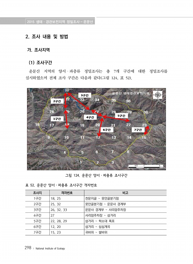2015 생태·경관보전지역 정밀조사 운문산 298 ? National Institute of Ecology 2. 조사 내용 및 방법 가. 조사지역 1 조사구간 운문산 지역의 양서ㆍ파충류 정밀조사는 총 7개 구간에 대한 정밀조사를 실시하였으며 전체 조사 구간은 다음과 같다 그림 124, 표 52 그림 124. 운문산 양서ㆍ파충류 조사구간 조사지 격자번호 비고 1구간 18, 25 천문지골 못안골분기점 2구간 25, 32 못안골분기점 운문사 경계부 3구간 26, 32, 33 운문사 경계부 사리암주차장 4구간 27 사리암주차장 삼거리 5구간 22, 28, 29 삼거리 학소대 폭포 6구간 12, 20 삼거리 심심계곡 7구간 15, 23 귀바위 쌀바위 표 52. 운문산 양서ㆍ파충류 조사구간격자번호
