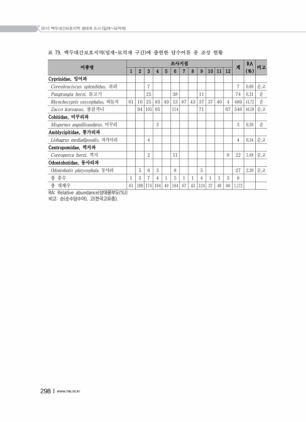 2016 백두대간보호지역 생태계 조사 밀재묘적재 298Ⅰwww.nie.re.kr 어종명 조사지점 계 RA 1 2 3 4 5 6 7 8 9 10 11 12 % 비고 Cyprinidae, 잉어과 Coreoleuciscus splendidus, 쉬리 7 7 0.60 순,고 Pungtungia herzi, 돌고기 25 38 11 74 6.31 순 Rhynchocypris oxycephalus, 버들치 61 10 25 83 49 13 87 43 37 37 40 4 489 41.72 순 Zacco koreanus, 참갈겨니 94 105 95 114 71 67 546 46.59 순,고 Cobitidae, 미꾸리과 Misgurnus anguillicaudatus, 미꾸리 3 3 0.26 순 Amblycipitidae, 퉁...