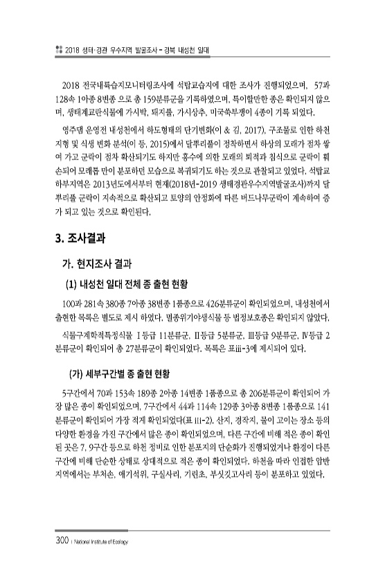 2018 생태·경관 우수지역 발굴조사 경북 내성천 일대 300 ? National Institute of Ecology 2018 전국내륙습지모니터링조사에 석탑교습지에 대한 조사가 진행되었으며, 57과 128속 1아종 8변종 으로 총 159분류군을 기록하였으며, 특이할만한 종은 확인되지 않으 며, 생태계교란식물에 가시박, 돼지풀, 가시상추, 미국쑥부쟁이 4종이 기록 되었다. 영주댐 운영전 내성천에서 하도형태의 단기변화 이 & 김, 2017 , 구조물로 인한 하천 지형 및 식생 변화 분석 이 등, 2015 에서 달뿌리풀이 정착하면서 하상의 모래가 점차 쌓 여 가고 군락이 점차 확산되기도 하지만 홍수에 의한 모래의 퇴적과 침식으로 군락이 훼 손되어 모래톱 만이 분포하던 모습으로 복귀되기도 하는 것으로 관찰되고 있...