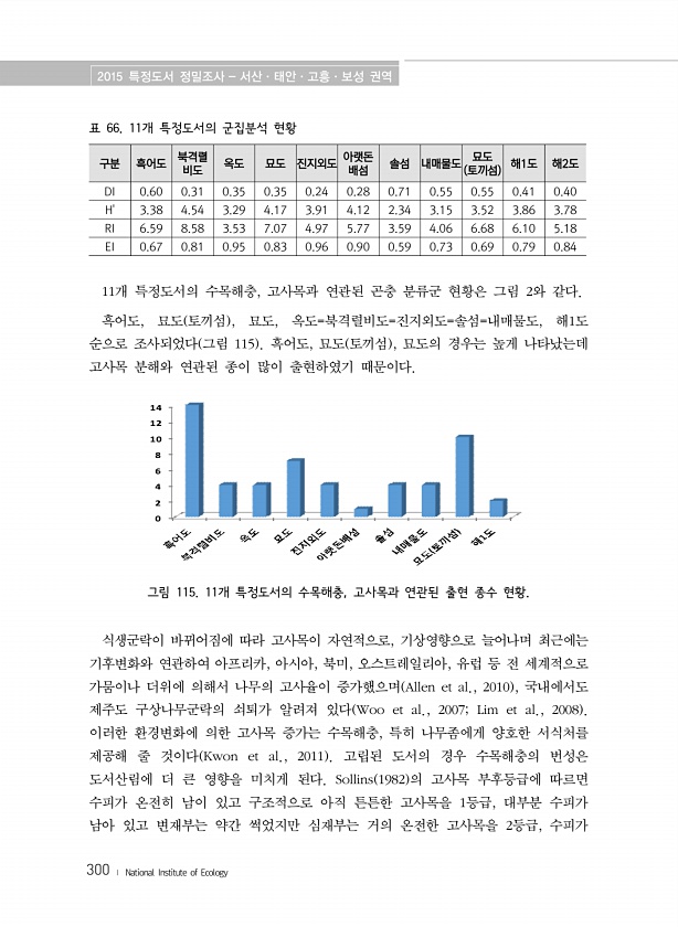 2015 특정도서 정밀조사 서산·태안·고흥·보성 권역 300 ? National Institute of Ecology 구분 흑어도 북격렬 비도 옥도 묘도 진지외도 아랫돈 배섬 솔섬 내매물도 토끼섬 묘도 해1도 해2도 DI 0.60 0.31 0.35 0.35 0.24 0.28 0.71 0.55 0.55 0.41 0.40 H3.38 4.54 3.29 4.17 3.91 4.12 2.34 3.15 3.52 3.86 3.78 RI 6.59 8.58 3.53 7.07 4.97 5.77 3.59 4.06 6.68 6.10 5.18 EI 0.67 0.81 0.95 0.83 0.96 0.90 0.59 0.73 0.69 0.79 0.84 표 66. 11개 특정도서의 군집분석 현황 11개 특정도서의 수목해충, 고사목과 연관된 ...