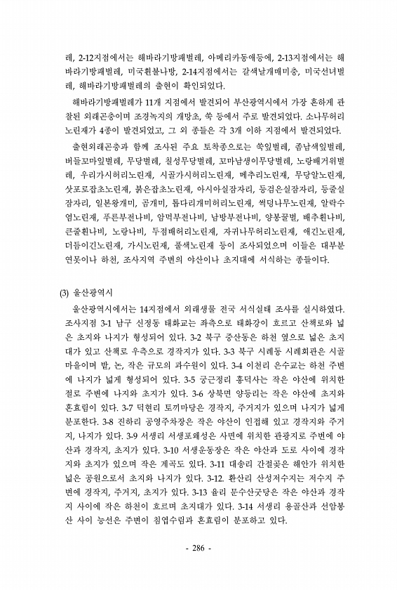 레, 2-12지점에서는 해바라기방패벌레, 아메리카동애등에, 2-13지점에서는 해 바라기방패벌레, 미국흰불나방, 2-14지점에서는 갈색날개매미충, 미국선녀벌 레, 해바라기방패벌레의 출현이 확인되었다. 해바라기방패벌레가 11개 지점에서 발견되어 부산광역시에서 가장 흔하게 관 찰된 외래곤충이며 조경녹지의 개망초, 쑥 등에서 주로 발견되었다. 소나무허리 노린재가 4종이 발견되었고, 그 외 종들은 각 3개 이하 지점에서 발견되었다. 출현외래곤충과 함께 조사된 주요 토착종으로는 쑥잎벌레, 좀남색잎벌레, 버들꼬마잎벌레, 무당벌레, 칠성무당벌레, 꼬마남생이무당벌레, 노랑배거위벌 레, 우리가시허리노린재, 시골가시허리노린재, 메추리노린재, 무당알노린재, 삿포로잡초노린재, 붉은잡초노린재, 아시아실잠자리, 등검은실잠자리, 등줄실...