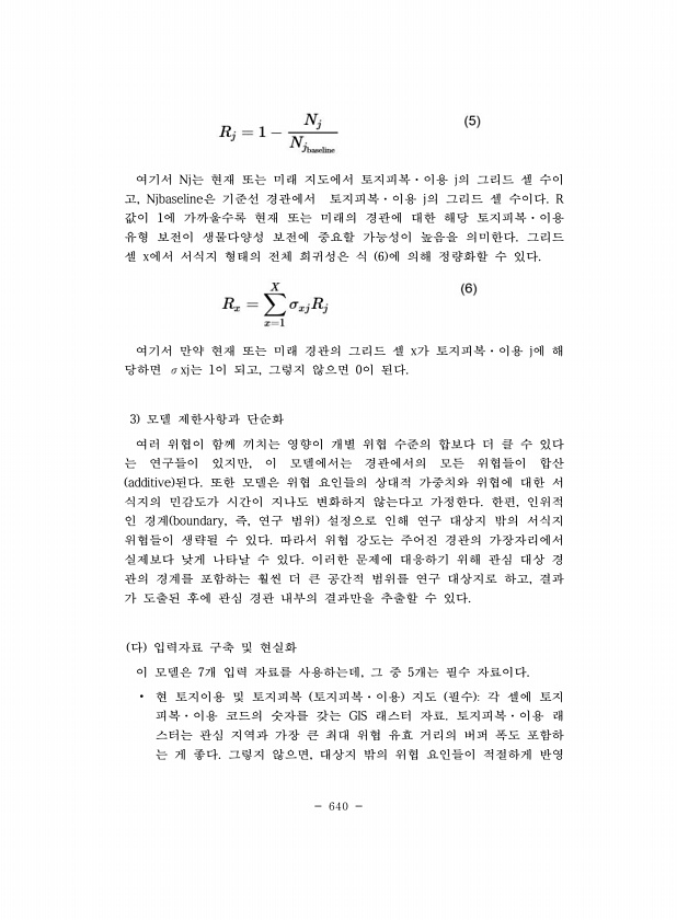 640 여기서 Nj는 현재 또는 미래 지도에서 토지피복·이용 j의 그리드 셀 수이 고, Njbaseline은 기준선 경관에서 토지피복·이용 j의 그리드 셀 수이다. R 값이 1에 가까울수록 현재 또는 미래의 경관에 대한 해당 토지피복·이용 유형 보전이 생물다양성 보전에 중요할 가능성이 높음을 의미한다. 그리드 셀 x에서 서식지 형태의 전체 희귀성은 식 6 에 의해 정량화할 수 있다. 여기서 만약 현재 또는 미래 경관의 그리드 셀 x가 토지피복·이용 j에 해 당하면 σxj는 1이 되고, 그렇지 않으면 0이 된다. 3 모델 제한사항과 단순화 여러 위협이 함께 끼치는 영향이 개별 위협 수준의 합보다 더 클 수 있다 는 연구들이 있지만, 이 모델에서는 경관에서의 모든 위협들이 합산 additive 된다. 또한 모델...