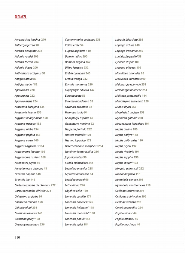 310 찾아보기 Aeromachus inachus 270 Ahlbergia ferrea 78 Aldania deliquata 202 Aldania raddei 206 Aldania themis 204 Aldania thisbe 200 Anthocharis scolymus 52 Antigius attilia 80 Antigius butleri 82 Apatura ilia 220 Apatura iris 222 Apatura metis 224 Araschnia burejana 134 Araschnia levana 136 Argynnis anadyomene 150 Argynnis nerippe 152 Argynnis niobe 154 Argynnis paphia 156 Argynnis vorax 160 Argyre...