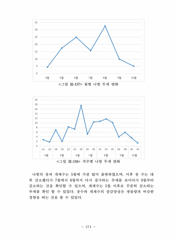 274 그림 Ⅲ-157 월별 나방 무게 변화 그림 Ⅲ-158 격주별 나방 무게 변화 나방의 종과 개체수는 5월에 가장 많이 출현하였으며, 이후 종 수는 대 폭 감소했다가 7월에서 8월까지 다시 증가하는 추세를 보이다가 9월부터 감소하는 것을 확인할 수 있으며, 개체수는 5월 이후로 꾸준히 감소하는 추세를 확인 할 수 있었다. 종수와 개체수의 증감양상은 생물량과 비슷한 경향을 띠는 것을 볼 수있었다.
