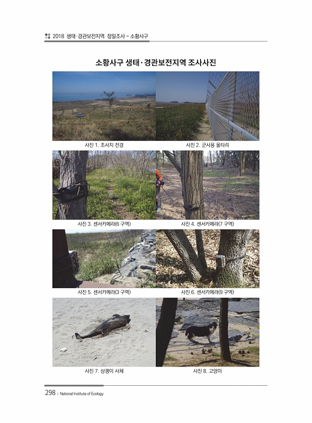 2018 생태·경관보전지역 정밀조사 소황사구 298 ? National Institute of Ecology 사진 1. 조사지 전경 사진 2. 군사용 울타리 사진 3. 센서카메라 6 구역 사진 4. 센서카메라 7 구역 사진 5. 센서카메라 3 구역 사진 6. 센서카메라 9 구역 사진 7. 상괭이 사체 사진 8. 고양이
