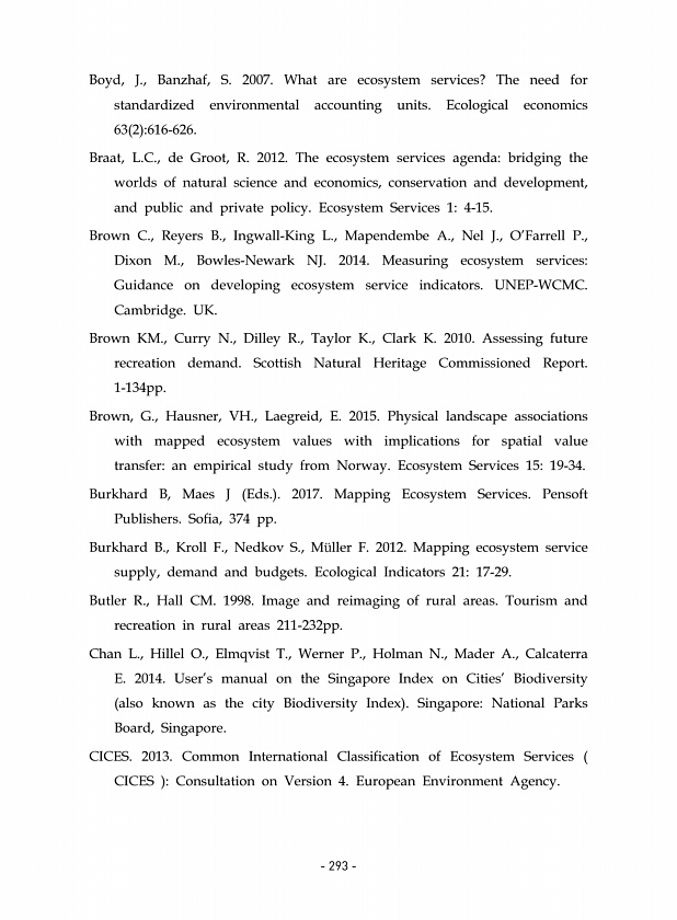 Boyd, J., Banzhaf, S. 2007. What are ecosystem services? The need for standardized environmental accounting units. Ecological economics 63 2 616-626. Braat, L.C., de Groot, R. 2012. The ecosystem services agendabridging the worlds of natural science and economics, conservation and development, and public and private policy. Ecosystem Services 14-15. Brown C., Reyers B., Ingwall-King L., Mapendembe...