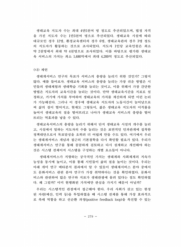 279 생태교육 지도자 수는 최대 4만5천여 명 정도로 추산되었으며, 법정 자격 을 가진 지도자 수는 1만3천여 명으로 추산되었다. 생태교육 시설에 따라 대규모인 경우 12명, 환경교육센터의 경우 6명, 생태교육관의 경우 3명 정도 의 지도자가 활동하는 것으로 조사되었다. 지도자 1인당 교육인원은 최소 약 2천명에서 최대 약 4천명으로 조사되었다. 이를 바탕으로 평가한 생태교 육 서비스의 가치는 최소 1,680억에서 최대 4,200억 정도로 추산되었다. 나 제언 생태계서비스 연구의 목표가 서비스의 총량을 늘리기 위한 것인가? 그렇지 않다. 예를 들어보자. 생태교육 서비스의 총량을 늘리는 가장 쉬운 방법은 시 민들의 생태체험과 생태학습 기회를 늘리는 것이고, 이를 위해서 가장 간단한 방법은 지도자의 교육시간을...