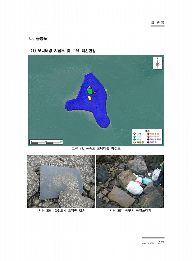 Ⅲ. 종 합 www.nie.re.kr ? 299 다. 뭉퉁도 1 모니터링 지점도 및 주요 훼손현황 그림 71. 뭉퉁도 모니터링 지점도 사진 303. 특정도서 표지판 훼손 사진 304. 해변의해양쓰레기