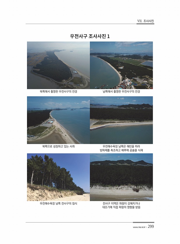 VII. 조사사진 www.nie.re.kr ?299 북쪽에서 촬영한 우전사구의 전경 남쪽에서 촬영한 우전사구의 전경 북쪽으로 성장하고 있는 사취 우전해수욕장 남쪽은 해빈을 따라 방파제를 축조하고 배후에 곰솔을 식재 우전해수욕장 남쪽 전사구의 침식 전사구 지역은 파랑이 강해지거나 대조기에 직접 파랑의 영향을 받음1