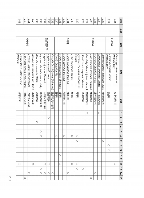 285 번호 목명 과명 학명 국명 1 2 3 4 5 6 7 8 9 10 11 12 13 14 15 721 홍날개과 Pseudopyrochroa lateralis Motschulsky 홍다리홍날개 ○ 722 Pseudopyrochroa rufula Motschulsky 홍날개 ○ ○ 723 뿔벌레과 Anthicomorphus niponicus Lewis 검은좀뿔벌레 ○ 724 Formicomus braminus Laferte F. braminus ○ 725 Macratria japonica Harold 장구목뿔벌레 ○ 726 Mecynotarsus tenuipes Champion 삼각뿔벌레 ○ 727 Pseudoleptaleus trigibber Marseul 끝검은뿔벌레 ○ 728 Stricticomus v...