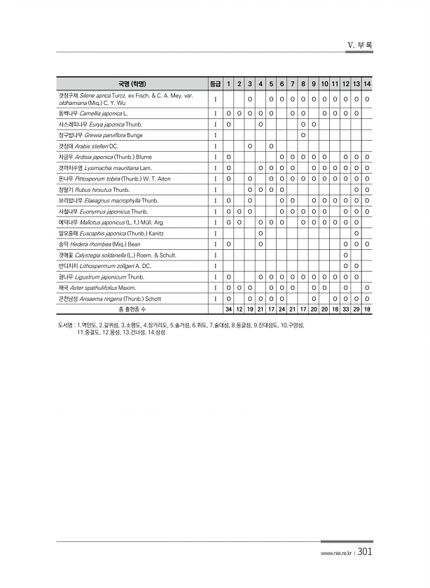 V. 부 록 www.nie.re.kr ?301 도서명 1.역만도, 2.갈퀴섬, 3.소평도, 4.장거리도, 5.솔거섬, 6.취도, 7.술대섬, 8.둥글섬, 9.진대섬도, 10.구멍섬, 11.중결도, 12.용섬, 13.건너섬, 14.상섬 국명 학명 등급 1 2 3 4 5 6 7 8 9 10 11 12 13 14 갯장구채 Silene aprica Turcz. ex Fisch. & C. A. Mey. var. oldhamiana Miq. C. Y. Wu Ⅰ O O O O O O O O O O O 동백나무 Camellia japonica L. Ⅰ O O O O O O O O O O O 사스레피나무 Eurya japonica Thunb. Ⅰ O O O O 장구밥나무 Grewia parviflora Bunge Ⅰ O 갯...