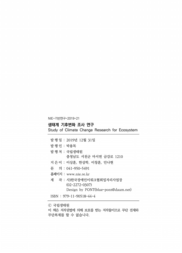 NIE-기반연구-2019-21 생태계 기후변화 조사 연구 Study of Climate Change Research for Ecosystem 발 행 일 2019년 12월 31일 발 행 인 박용목 발 행 처 국립생태원 충청남도 서천군 마서면 금강로 1210 지 은 이 이상훈, 한상학, 이창훈, 안나현 문 의 041-950-5491 홈페이지 www.nie.re.kr 제 작 사 한국장애인이워크협회일자리사업장 02-2272-0307 Design by PONT blue-pont@daum.net ISBN 979-11-90518-44-4 ? 국립생태원 이 책은 저작권법에 의해 보호를 받는 저작물이므로 무단 전재와 무단복제를 할 수없습니다.