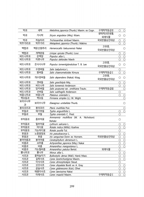 299 박과 새박 Melothria japonica Thunb. Maxim. ex Cogn. 구계학적등급Ⅱ ○ ○ 박과 가시박 Sicyos angulatus Miq. Kitam. 생태계교란생물, 외래식물 ○ ○ 박과 하늘타리 Trichosanthes kirilowii Maxim. 국외반출승인대상 ○ ○ 박주가리과 박주가리 Metaplexis japonica Thunb. Makino ○ ○ 백합과 백운산원추리 Hemerocallis hakuunensis Nakai 고유종, 국외반출승인대상 ○ 백합과 개맥문동 Liriope spicata Thunb. Lour. ○ ○ 버드나무과 은백양 Populus alba L. ○ ○ 버드나무과 미류나무 Populus deltoides Marsh ○ ○ 버드나무과 은사시나무 ...
