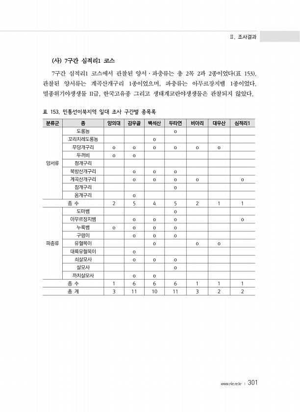 Ⅱ. 조사결과 www.nie.re.kr ? 301 사 7구간 심적리1 코스 7구간 심적리1 코스에서 관찰된 양서·파충류는 총 2목 2과 2종이었다 표 153 관찰된 양서류는 계곡산개구리 1종이었으며, 파충류는 아무르장지뱀 1종이었다. 멸종위기야생생물 II급, 한국고유종 그리고 생태계교란야생생물은 관찰되지 않았다. 분류군 종 양의대 감우골 백석산 두타연 비아리 대우산 심적리1 양서류 도롱뇽 o 꼬리치레도롱뇽 o 무당개구리 o o o o o o 두꺼비 o o 청개구리 북방산개구리 o o o 계곡산개구리 o o o o o 참개구리 o 옴개구리 o 종 수 2 5 4 5 2 1 1 파충류 도마뱀 o 아무르장지뱀 o o o o 누룩뱀 o o o o 구렁이 o o o 유혈목이 o o o 대륙유혈목이 o 쇠살모사 o o ...