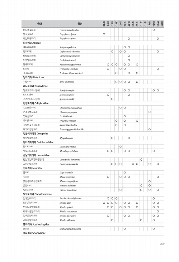 309 마디풀꽃파리 Pegomya quadrivittata ○ 넓적꽃파리 Pegoplata palposa ○ 애넓적꽃파리 Pegoplata virginea ○ ○ 파리매과 Asilidae 홍다리파리매 Antipalus pedestris ○ ○ 왕파리매 Cophinopoda chinensis ○ ○ ○ ○ 배털보파리매 Cyrtopogon pictipennis ○ 뒤영벌파리매 Laphria mitsukurii ○ 광대파리매 Neoitamus angusticornis ○ ○ ○ ○ ○ ○ 파리매 Promachus yesonicus ○ ○ ○ ○ 검정파리매 Trichomachimus scutellaris ○ ○ ○ 털파리과 Bibionidae 검털파리 Bibio tenebrosus ○ ○ ○ ○ ○ 재니등에과 Bo...