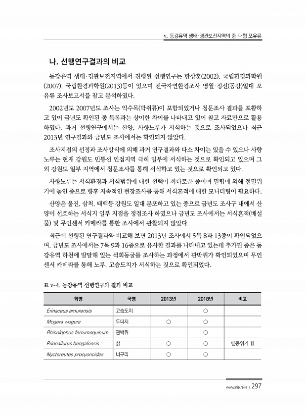 v. 동강유역 생태·경관보전지역의 중·대형 포유류 www.nie.re.kr ?297 동강유역 생태·경관보전지역에서 진행된 선행연구는 한상훈 2002 , 국립환경과학원 2007 , 국립환경과학원 2013 등이 있으며 전국자연환경조사 영월·정선 동강 일대 포 유류 조사보고서를 참고 분석하였다. 2002년도 2007년도 조사는 익수목 박쥐류 이 포함되었거나 청문조사 결과를 포홤하 고 있어 금년도 확인된 종 목록과는 상이한 차이를 나타내고 있어 참고 자료만으로 활용 하였다. 과거 선행연구에서는 산양, 사향노루가 서식하는 것으로 조사되었으나 최근 2013년 연구결과와 금년도 조사에서는 확인되지 않았다. 조사지점의 선정과 조사방식에 의해 과거 연구결과와 다소 차이는 있을 수 있으나 사향 노루는 현재 강원도 민통선 인접...