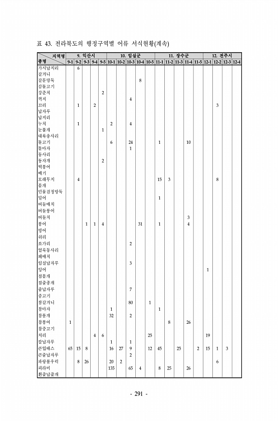 291 표 43. 전라북도의 행정구역별 어류 서식현황 계속 지역명 종명 9. 익산시 10. 임실군 11. 장수군 12. 전주시 9-1 9-2 9-3 9-4 9-5 10-1 10-2 10-3 10-4 10-5 11-1 11-2 11-3 11-4 11-5 12-1 12-2 12-3 12-4 가시납지리 6 갈겨니 갈문망둑 8 감돌고기 강준치 2 꺽지 4 끄리 1 2 3 납자루 납지리 누치 1 2 4 눈불개 1 대륙송사리 돌고기 6 24 1 10 돌마자 1 동사리 동자개 2 떡붕어 메기 모래무지 4 15 3 8 몰개 민물검정망둑 밀어 1 버들매치 버들붕어 버들치 3 붕어 1 1 4 31 1 4 빙어 쉬리 쏘가리 2 얼룩동사리 왜매치 임실납자루 3 잉어 1 점몰개 점줄종개 줄납자루 7 중고기 참갈겨니 80 1 참마자...