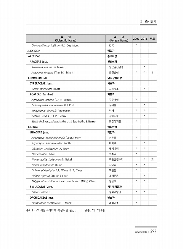 Ⅱ. 조사결과 www.nie.re.kr ? 297 학 명 Scientific Name 국 명 Korean Name 2007 2016 비고 Dendranthema indicum L. Des Moul. 감국 * LILIOPSIDA 백합강 ARECIDAE 종려아강 ARACEAE Juss. 천남성과 Arisaema amurense Maxim. 둥근잎천남성 * Arisaema ringens Thunb. Schott 큰천남성 * * Ⅰ COMMELINIDAE 닭의장풀아강 CYPERACEAE Juss. 사초과 Carex lanceolata Boott 그늘사초 * POACEAE Barnhart 화본과 Agropyron repens L. P. Beauv. 구주개밀 * Calamagrostis arundinacea L. Rr...