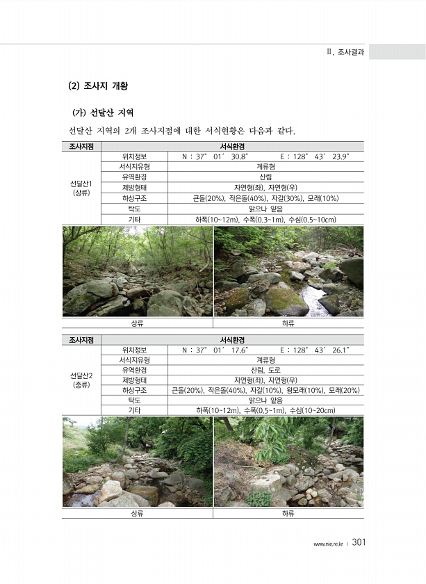 Ⅱ. 조사결과 www.nie.re.kr ? 301 2 조사지 개황 가 선달산 지역 선달산 지역의 2개 조사지점에 대한 서식현황은 다음과 같다. 조사지점 서식환경 선달산1 상류 위치정보 N 37° 01′ 30.8″ E 128° 43′ 23.9″ 서식지유형 계류형 유역환경 산림 제방형태 자연형 좌 , 자연형 우 하상구조 큰돌 20% , 작은돌 40% , 자갈 30% , 모래 10% 탁도 맑으나 얕음 기타 하폭 1012m , 수폭 0.31m , 수심 0.510cm 상류 하류 조사지점 서식환경 선달산2 중류 위치정보 N 37° 01′ 17.6″ E 128° 43′ 26.1″ 서식지유형 계류형 유역환경 산림, 도로 제방형태 자연형 좌 , 자연형 우 하상구조 큰돌 20% , 작은돌 40% , 자갈 10% , 왕모래 1...