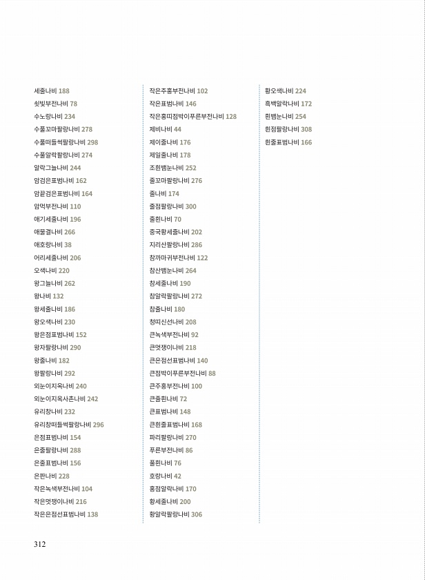 312 세줄나비 188 쇳빛부전나비 78 수노랑나비 234 수풀꼬마팔랑나비 278 수풀떠들썩팔랑나비 298 수풀알락팔랑나비 274 알락그늘나비 244 암검은표범나비 162 암끝검은표범나비 164 암먹부전나비 110 애기세줄나비 196 애물결나비 266 애호랑나비 38 어리세줄나비 206 오색나비 220 왕그늘나비 262 왕나비 132 왕세줄나비 186 왕오색나비 230 왕은점표범나비 152 왕자팔랑나비 290 왕줄나비 182 왕팔랑나비 292 외눈이지옥나비 240 외눈이지옥사촌나비 242 유리창나비 232 유리창떠들썩팔랑나비 296 은점표범나비 154 은줄팔랑나비 288 은줄표범나비 156 은판나비 228 작은녹색부전나비 104 작은멋쟁이나비 216 작은은점선표범나비 138 작은주홍부전나비 102 작은표범나...