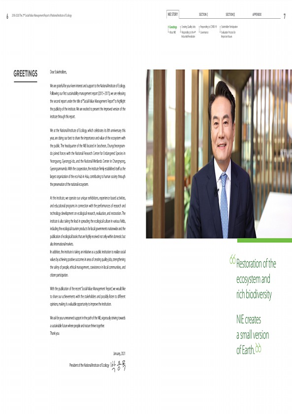 6 2018-2020 The 2nd Social Value Management Report of National Institute of Ecology NIE STORY SECTIONⅠ SECTIONⅡ APPENDIX 7 Greetings About NIE Creating Quality Jobs Responding to the 4th Industrial Revolution Stakeholder Participation Evaluation Process for Important Issues Responding to COVID-19 Governance Dear Stakeholders, We are grateful for your keen interest and support to the National Insti...