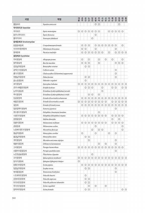 310 뿔들파리 Sepedon aenescens ○ ○ ○ 꼭지파리과 Sepsidae 꼭지파리 Sepsis monostigma ○ ○ ○ ○ ○ ○ ○ ○ ○ ○ ○ ○ 등무늬꼭지파리 Sepsis thoracica ○ 뿔꼭지파리 Xenosepsis fukuharai ○ 동애등에과 Stratiomyidae 방울동애등에 Craspedometopon frontale ○ ○ ○ ○ ○ ○ ○ ○ ○ ○ ○ 히라야마동애등에 Odontomyia hirayamae ○ ○ ○ ○ 동애등에 Ptecticus tenebrifer ○ ○ ○ ○ ○ ○ ○ ○ ○ ○ ○ ○ 꽃등에과 Syrphidae 쟈바꽃등에 Allograpta javana ○ ○ ○ ○ ○ ○ 알락꽃등에 Baccha maculata ○ ○ ○ ○ ○ ○ ○ ...
