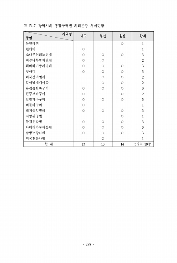 표 Ⅳ-7. 광역시의 행정구역별 외래곤충 서식현황 지역명 종명 대구 부산 울산 합계 독일바퀴 ○ 1 흰개미 ○ 1 소나무허리노린재 ○ ○ ○ 3 버즘나무방패벌레 ○ ○ 2 해바라기방패벌레 ○ ○ ○ 3 꽃매미 ○ ○ ○ 3 미국선녀벌레 ○ ○ 2 갈색날개매미충 ○ ○ 2 유럽좁쌀바구미 ○ ○ ○ 3 큰뚱보바구미 ○ ○ 2 알팔파바구미 ○ ○ ○ 3 벼물바구미 ○ 1 돼지풀잎벌레 ○ ○ ○ 3 서양뒤영벌 ○ 1 등검은말벌 ○ ○ ○ 3 아메리카동애등에 ○ ○ ○ 3 남방노랑나비 ○ ○ ○ 3 미국흰불나방 ○ 1 합 계 13 13 14 3지역 18종 288