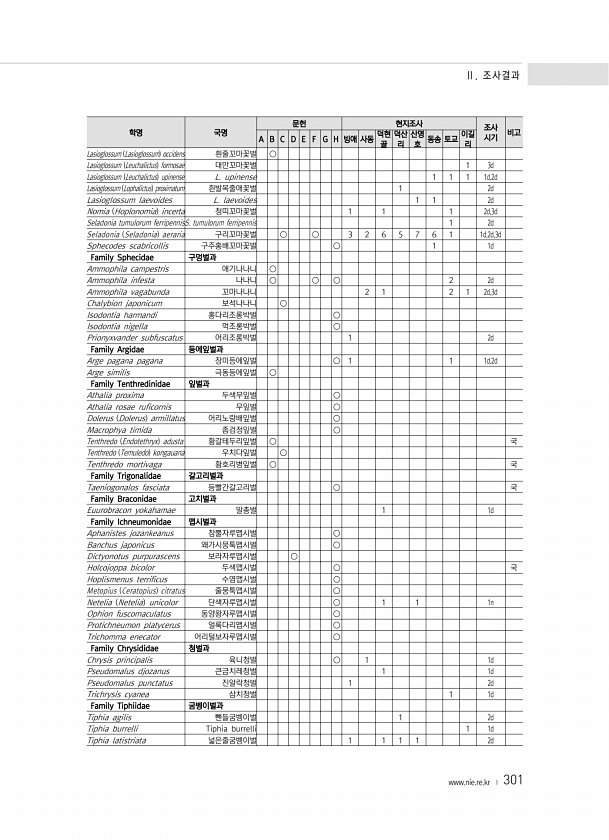 Ⅱ. 조사결과 www.nie.re.kr ? 301 학명 국명 문헌 현지조사 조사 A B C D E F G H 빙애 사동 덕현 시기 비고 골 덕산 리 산명 호 동송 토교 이길 리 Lasioglossum Lasioglossum occidens 흰줄꼬마꽃벌 ○ Lasioglossum Leuchalictus formosae 대만꼬마꽃벌 1 3d Lasioglossum Leuchalictus upinense L. upinense 1 1 1 1d,2d Lasioglossum Lophalictus proximatum 흰발목줄애꽃벌 1 2d Lasioglossum laevoides L. laevoides 1 1 2d Nomia Hoplonomia incerta 청띠꼬마꽃벌 1 1 1 2d,3d Seladonia tumul...