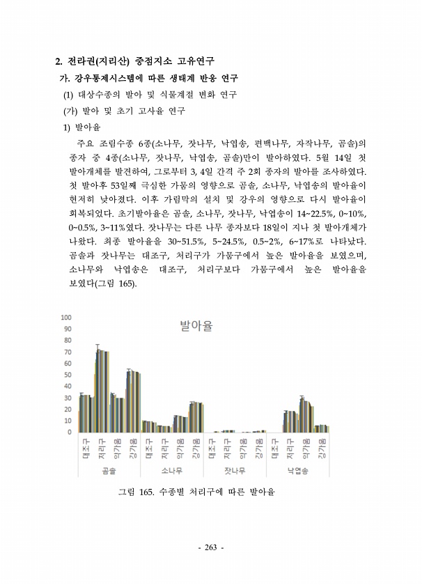 263 그림 165. 수종별 처리구에 따른 발아율 2. 전라권 지리산 중점지소 고유연구 가. 강우통제시스템에 따른 생태계 반응 연구 1 대상수종의 발아 및 식물계절 변화 연구 가 발아 및 초기 고사율 연구 1 발아율 주요 조림수종 6종 소나무, 잣나무, 낙엽송, 편백나무, 자작나무, 곰솔 의 종자 중 4종 소나무, 잣나무, 낙엽송, 곰솔 만이 발아하였다. 5월 14일 첫 발아개체를 발견하여, 그로부터 3, 4일 간격 주 2회 종자의 발아를 조사하였다. 첫 발아후 53일째 극심한 가뭄의 영향으로 곰솔, 소나무, 낙엽송의 발아율이 현저히 낮아졌다. 이후 가림막의 설치 및 강우의 영향으로 다시 발아율이 회복되었다. 초기발아율은 곰솔, 소나무, 잣나무, 낙엽송이 1422.5%, 010%, 00.5%, 311%였다....