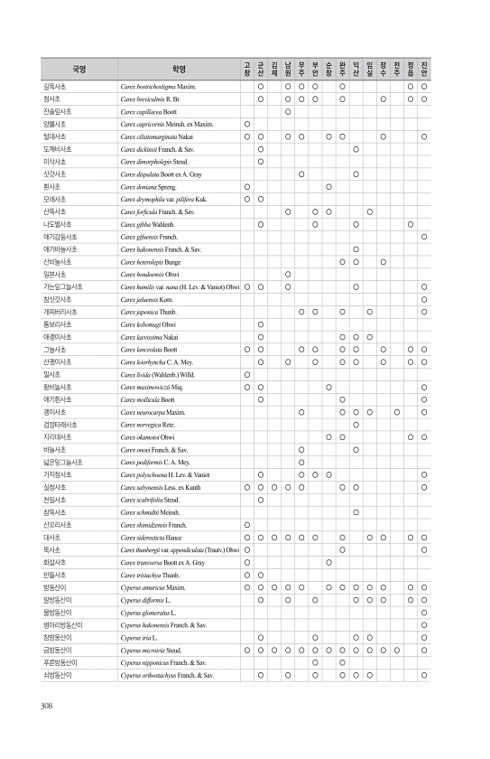 308 길뚝사초 Carex bostrichostigma Maxim. ○ ○ ○ ○ ○ ○ ○ 청사초 Carex breviculmis R. Br. ○ ○ ○ ○ ○ ○ ○ ○ 잔솔잎사초 Carex capillacea Boott ○ 양뿔사초 Carex capricornis Meinsh. ex Maxim. ○ 털대사초 Carex ciliatomarginata Nakai ○ ○ ○ ○ ○ ○ ○ ○ 도깨비사초 Carex dickinsii Franch. & Sav. ○ ○ 이삭사초 Carex dimorpholepis Steud. ○ 삿갓사초 Carex dispalata Boott ex A. Gray ○ ○ 흰사초 Carex doniana Spreng. ○ ○ 모래사초 Carex drymophila var. pilif...
