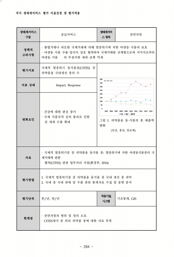국가 생태계서비스 평가 지표선정 및 평가적용 284 생태계서비스 구분 공급서비스 생태계서비 스 항목 천연자원 정책적 고려사항 · 불법거래나 과도한 국제거래에 의해 멸종위기에 처한 야생동 식물의 보호 · 야생동 식물 수출 입국이 상호 협력하여 국제거래를 규제함으로써 서식지로부터 야생동 식물 의 무질서한 채취 포획 억제 평가지표 국제적 멸종위기 동식물종 CITES 중 의약품용 국내생산 종의 수 그림 1. 의약품용 동·식물의 총 매출액 변화 인삼, 홍삼, 알로에 지표 상태 Impact, Response 변화요인 · 건강에 대한 관심 증가 · 국제 식품규격 심의 통과로 인한 전 세계 수출 확대 자료 · 국제적 멸종위기종 중 의약품용 동식물 종멸종위기에 처한 야생동식물종의 국 제거래에 관한 협약 CITES 관련 업무...