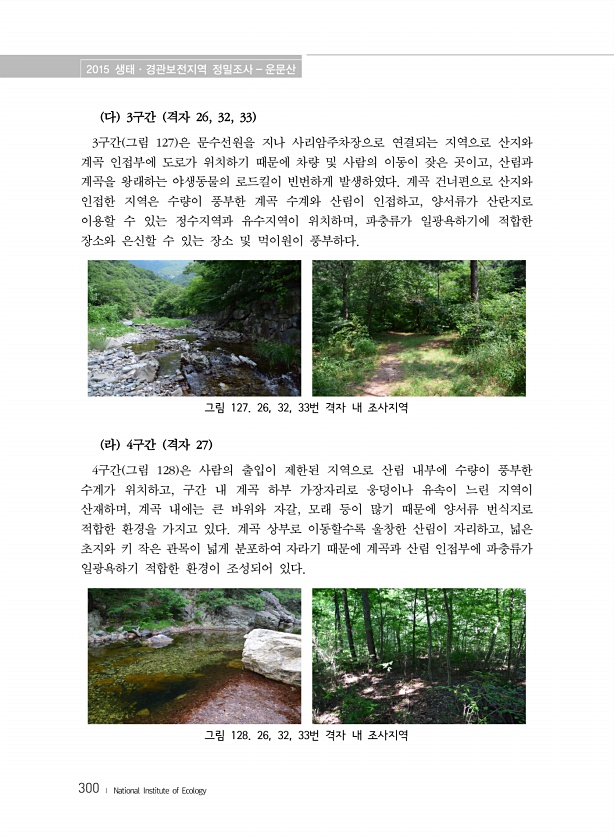 2015 생태·경관보전지역 정밀조사 운문산 300 ? National Institute of Ecology 다 3구간 격자 26, 32, 33 3구간 그림 127 은 문수선원을 지나 사리암주차장으로 연결되는 지역으로 산지와 계곡 인접부에 도로가 위치하기 때문에 차량 및 사람의 이동이 잦은 곳이고, 산림과 계곡을 왕래하는 야생동물의 로드킬이 빈번하게 발생하였다. 계곡 건너편으로 산지와 인접한 지역은 수량이 풍부한 계곡 수계와 산림이 인접하고, 양서류가 산란지로 이용할 수 있는 정수지역과 유수지역이 위치하며, 파충류가 일광욕하기에 적합한 장소와 은신할 수 있는 장소 및 먹이원이 풍부하다. 그림 127. 26, 32, 33번 격자 내 조사지역 라 4구간 격자 27 4구간 그림 128 은 사람의 출입이 제한된 지역...
