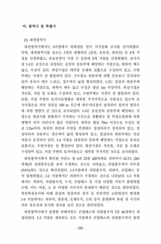 293 마. 광역시 및 특별시 1 대전광역시 대전광역시에서는 4지점에서 외래생물 전국 서식실태 조사를 실시하였다. 특히, 대전광역시를 흐르는 3개의 대형하천 갑천, 유등천, 대전천 중 4개 지 점을 선정하였고, 유로연장이 가장 긴 갑천에 2개 지점을 선정하였다. 조사지 점 1-1은 금강으로 유입되는 갑천의 중류부에 해당하는 지점으로, 하폭이 매우 넓고, 수심이 깊다. 하상기질은 대부분 모래와 진흙으로 구성되어 있고, 수변 부에는 식생이 잘 발달되어 있다. 가수원교 하류부에 대형 인공보가 설치되어 있어 유속이 매우 느리고, 정수역이 넓게 형성되었다. 1-2는 갑천의 하류부에 해당하는 지점으로, 하폭이 매우 넓고 수심은 평균 1m 이상이다. 하상기질은 작은돌, 자갈 및 모래로 구성되어 있고, 수변부에는 식생이 ...